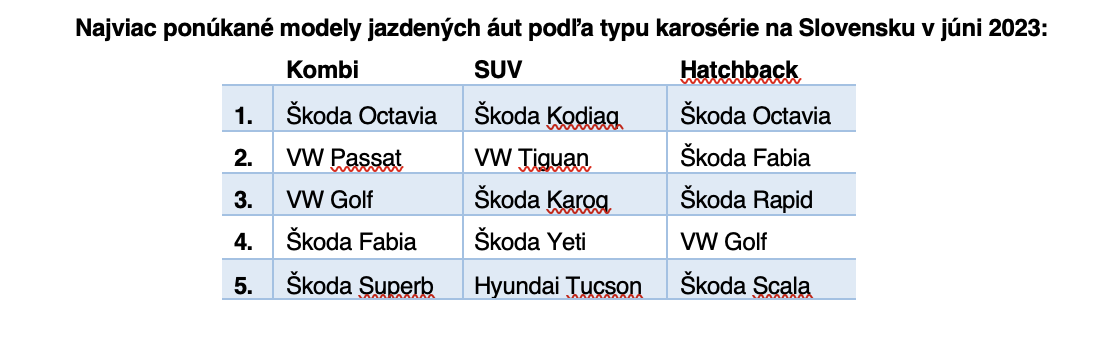 Najčastejšie inzerovanou značkou bola v júni tradične Škoda s 9 270 ponúkanými jazdenými vozidlami, nasledoval Volkswagen (7 774 áut) a BMW (4 332 áut). Z jednotlivých modelov bolo ponúknutých najviac vozidiel Škoda Octavia (3 993 áut) a Volkswagen Passat (2 024 áut), ktoré zároveň patria aj medzi najžiadanejšie automobily.