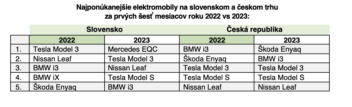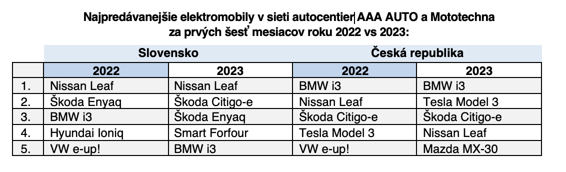 Čo sa týka najpredávanejších modelov elektrických vozidiel v autocentrách AAA AUTO a Mototechna v tomto roku, na Slovensku stále dominuje Nissan Leaf, ktorý tento rok predstavoval 25 % predajov medzi elektromobilmi, a v Českej republike je to BMW i3, ktoré predstavovalo 18 % predajov v kategórii elektrických vozidiel. Priemerný vek batériových áut sa na Slovensku drží na hranici troch rokov, s nájazdom okolo 50 000 kilometrov. V tomto roku si zákazníci najčastejšie kupovali elektromobily v bielej (37 %), strieborno-šedej (25 %) a čiernej (18 %) farbe.