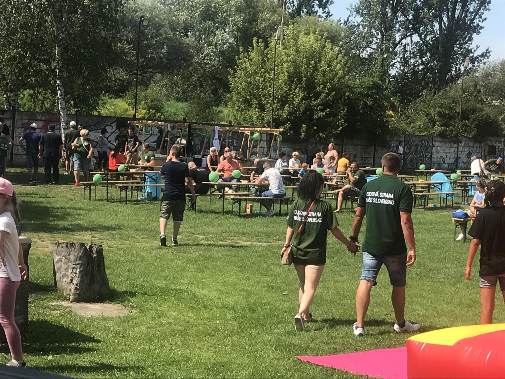 Atmosféra bola ako na prvomájovom sprievode - balóniky, guláš, pivo, párky, zástavy. Rodiny s deťmi a usmievajúci sa oteckovia fotili malé deti pri nafukovacom skákacom dome v dúhových farbách. V čase plánovaného začiatku podujatia o 14.00 hod. bolo na mieste už okolo dvesto ľudí. Podľa poznávacích značiek áut prišli z celého Slovenska, od Piešťan až po Michalovce.