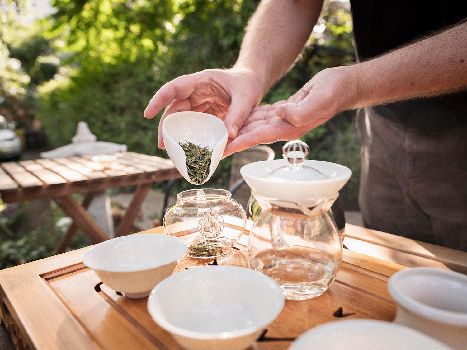 Jozef pre demonštráciu prípravy vybral obľúbený čínsky zelený čaj Dračia studňa (Lung Ching). Ideálna gramáž na 2 dcl vody, podobne ako pri všetkých čajoch, je 5 gramov.