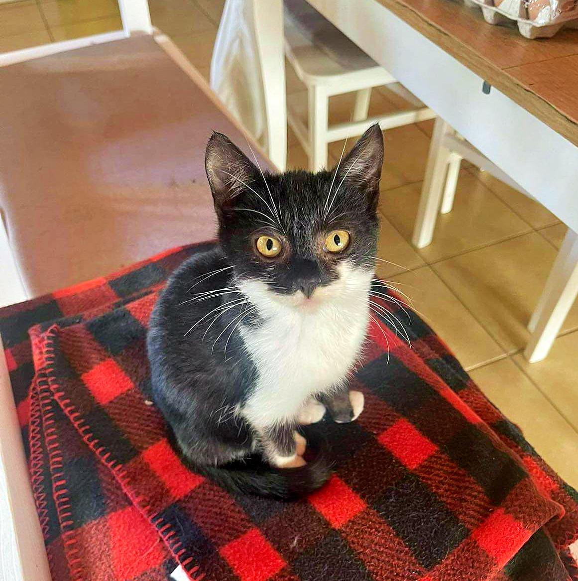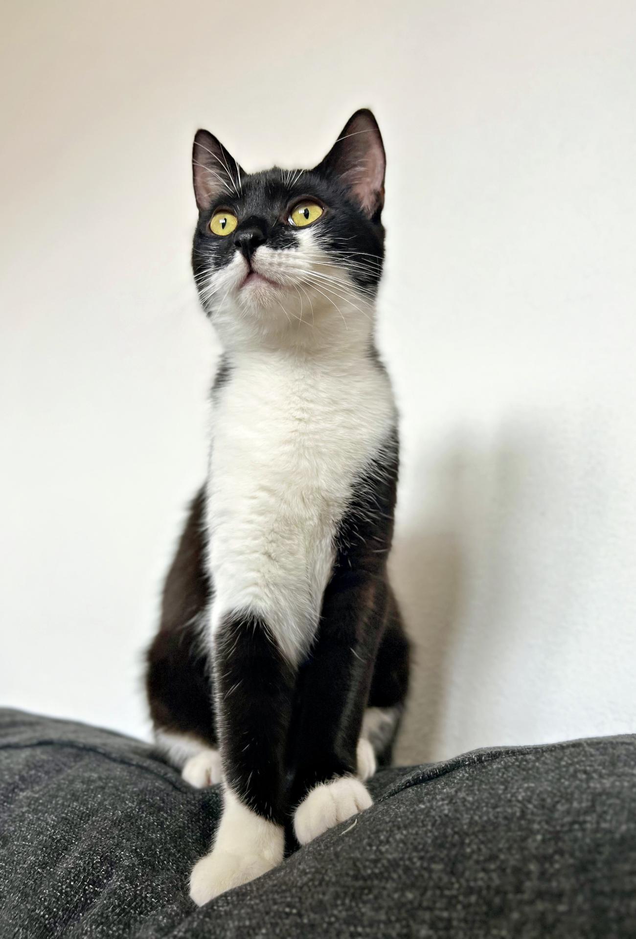 Keď som videl na fotke Betty, vedel som, že to bude ona. Nádherná čiernobiela mačka farebného vzoru Tuxedo, čo znamená smoking. Toto je ona na jej prvej fotke ešte z dočasky. Zaiskrilo to riadne a určite sa mi nečudujete. A keďže som trochu vizuálny estét, už som mal pred očami priamo hollywoodsky mačací pár.