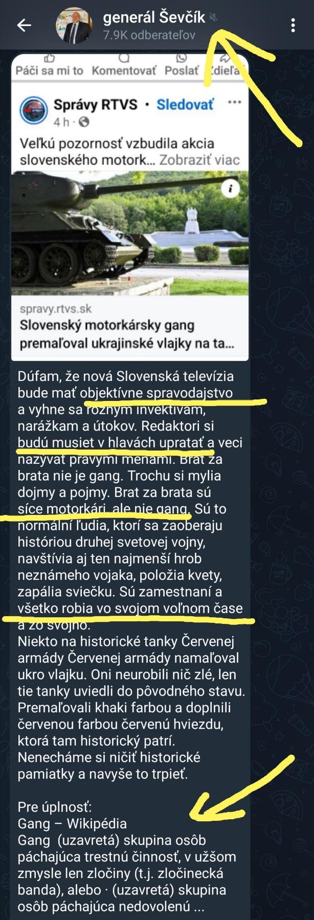 Článok bližšie popisoval jednu z tohtotýždňových tém – výlet kolaborantov z motorkárskeho klubu Brat za Brata, ktorí prišli na Dargov premaľovať ukrajinské vlajky na sovietskej vojenskej technike a vrátiť na ne červené hviezdy. Ševčíkovi sa konkrétne nepáčilo, že RTVS v článku použila slovo „gang“.