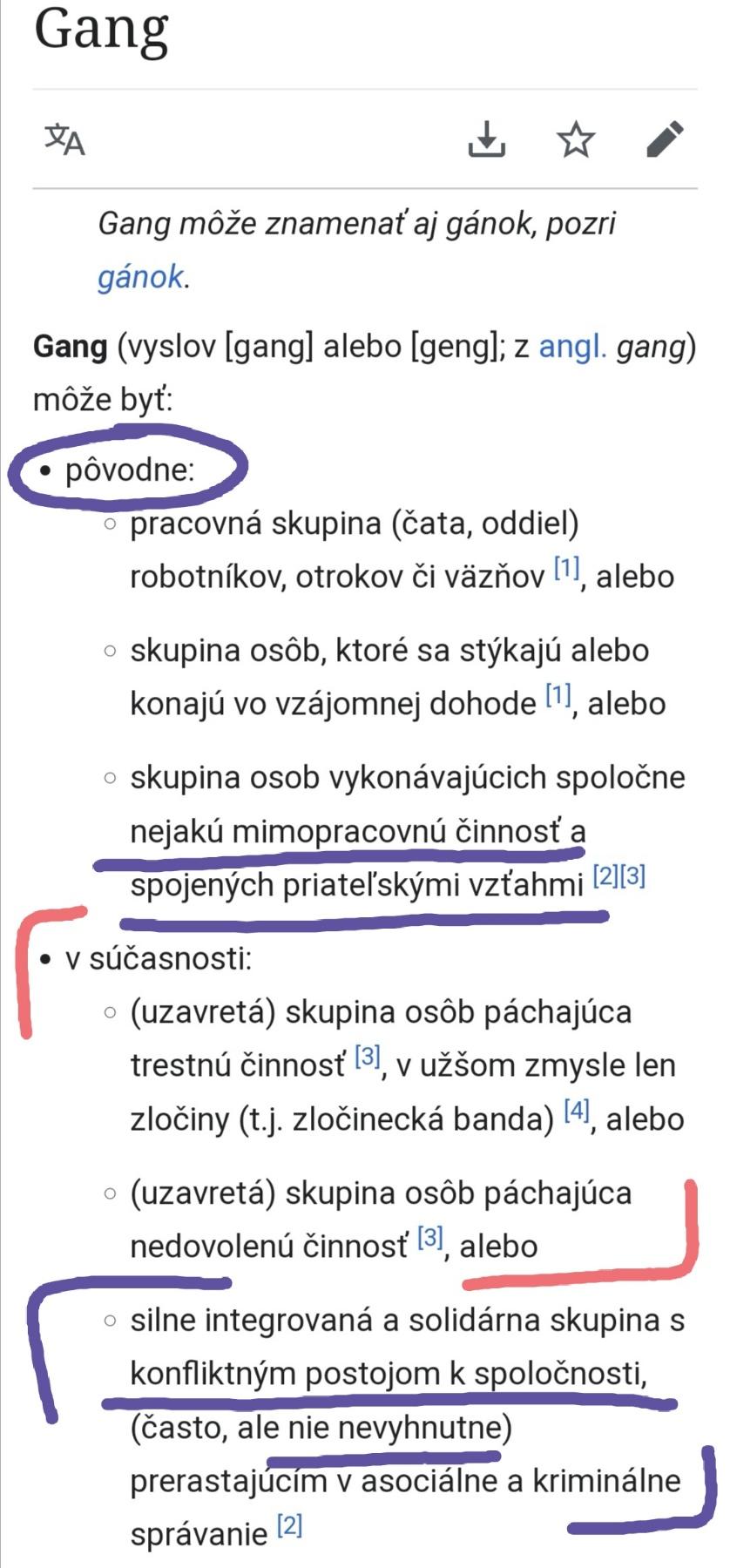 Zabudol napríklad dodať nasledovný význam: silne integrovaná a solidárna skupina s konfliktným postojom k spoločnosti, (často, ale nie nevyhnutne) prerastajúcím v asociálne a kriminálne správanie.