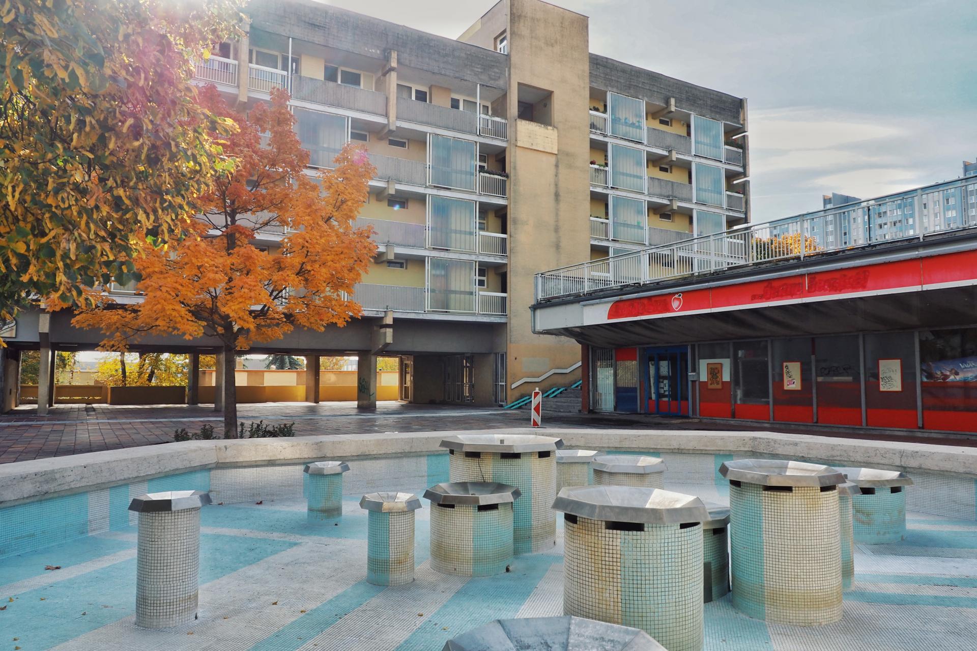 „Ježišmária, tu bolo živo!“ spomína Emil na časy, keď bolo námestíčko dokončené a nové bytovky boli ako teplé hniezdo pre mladé rodiny. Na časy, keď ešte fontána živo vyspevovala. Prázdne bledomodré dno s mozaikovými sklíčkami len pridáva k dystopickej kráse miesta.