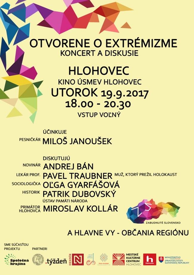 občianska iniciatíva Zabudnuté Slovensko pokračuje v ďalšom zo svojich podujatí v utorok 19.09.2017 v Hlohovci. Koncert a diskusia s názvom „Otvorene o extrémizme“ bude od 18:00 v kine Úsmev na ulici M.R.Štefánika. Prvýkrát sa táto občianska iniciatíva predstaví aj v západnom regióne Slovenska, pretože si uvedomuje, že témy a podnety, ktoré preberá na svojich diskusiách, sa týkajú celého Slovenska. A tento región Slovenska je takisto zasiahnutý plazivým vzostupom extrémizmu a nenávisti medzi nami navzájom.