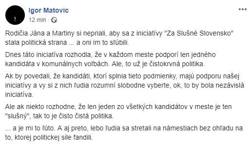 Zástupcovia iniciatívy deklarujú, že naďalej ostávajú občianskou iniciatívou a že do politiky nevstúpili. Uvedomujú si, že môže prísť časť kritiky za to, že niekoho podporia. „My však len hovoríme, že títo ľudia sa hlásia k vízii Slušné mestá a obce Slovenska a spĺňajú tie podmienky. Ak chceme zmenu v krajine a voláme po slušnom i spravodlivom Slovensku, tak cítime povinnosť povedať ľuďom, ako to vidíme my," uviedol člen iniciatívy Juraj Šeliga. Podporiť chcú aj ďalších nezávislých kandidátov na poslancov zastupiteľstiev či na primátorov a starostov v obciach a mestách Slovenska, ktorí sa budú hlásiť k vízii a ktorých si vyberú.