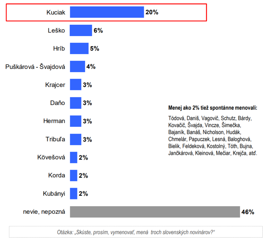 V prvej desiatke je aj reportér .týždňa Eugen Korda. Prieskum si objednalo Centrum pre nezávislú a objektívnu žurnalistiku a robila ho začiatkom novembra agentúra Focus na reprezentatívnej vzorke 1 012 respondentov formou osobných rozhovorov. Ide o najväčší prieskum na tieto témy, ktorý v poslednom čase na Slovensku vyšiel.