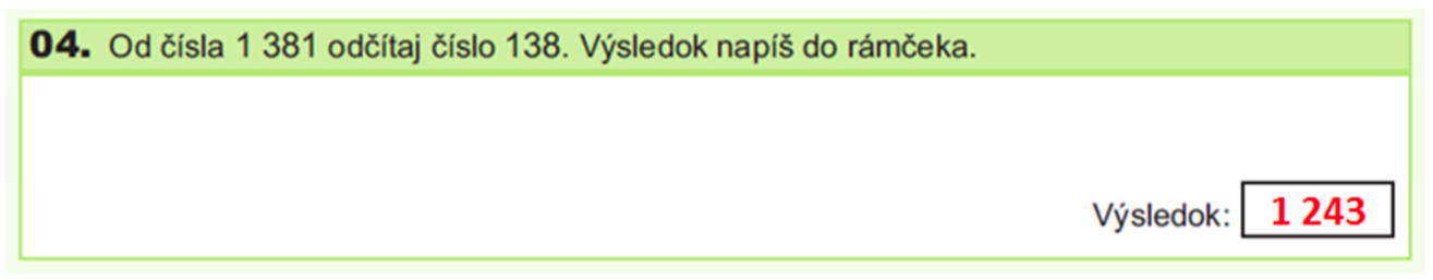 Deti bez znevýhodnenia tento príklad hodnotili ako ľahký, zvládlo ho 73 percent z nich. Pre deti zo sociálne znevýhodneného prostredia bola obtiažnosť diametrálne odlišná, vypočítala ho štvrtina. Najčastejšia nesprávna odpoveď bola 1257. „Každý desiaty žiak zo SZP neovláda algoritmus písomného odčítania,“ konštatuje NÚCEM.