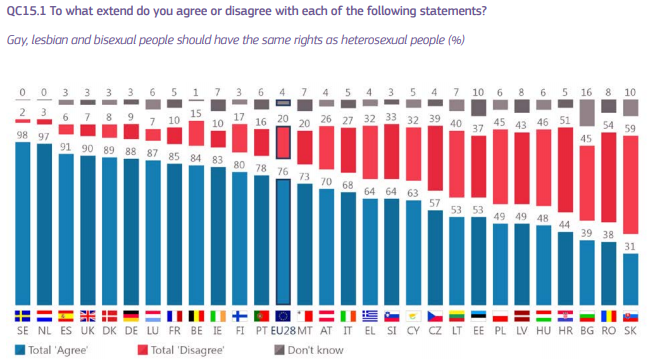 takmer 60 percent Slovákov si myslí, že gayovia, lesby a bisexuáli by nemali mať rovnaké práva ako heterosexuálni ľudia. Zaradili sme sa tak na úplný chvost všetkých krajín EÚ. Vyplýva to z prieskumu, ktorý uskutočnila Európska komisia.