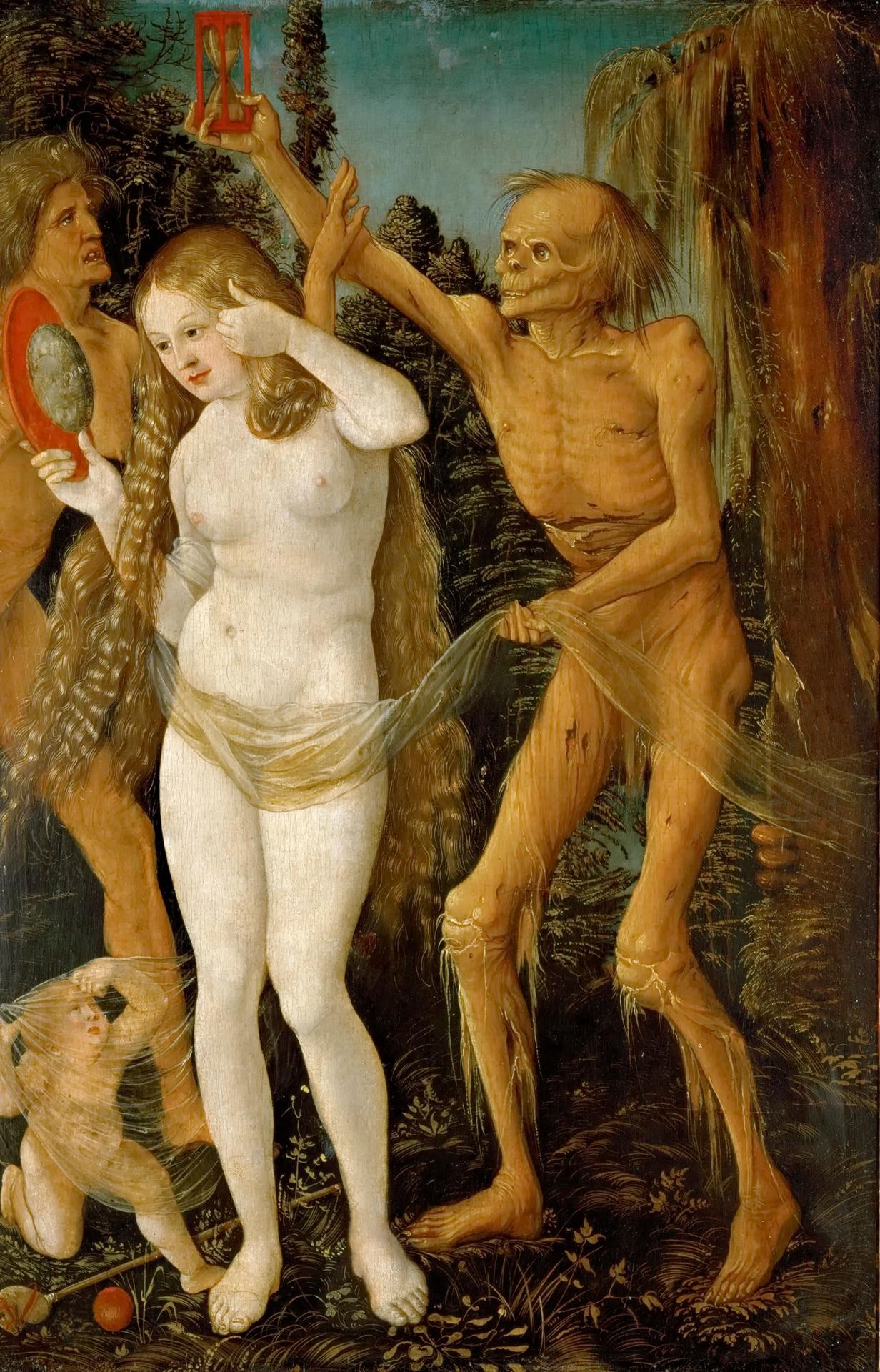 nemecký renesančný maliar Hans Baldung Grien namaľoval v roku 1510 obraz Tri veky ženy a smrť. Nahé dievča sa obzerá v konvexnom zrkadle, zatiaľ čo za ňou je jej starecká podoba (takmer ako kostlivec obalený zvyškovým mäsom). Starena dvíha do výšky presýpacie hodiny, aby ukázala, že čas sa zastaviť nedá. Tá istá žena v stredných rokoch sa snaží jej hodiny odtlačiť preč. Nechce vidieť to, čo sa nezadržateľne blíži, a zároveň akoby odtláčala aj zrkadlo od mladej dievčiny, aby v ňom nemusela zazrieť všetko, čo sa odvtedy na nej samej zmenilo.