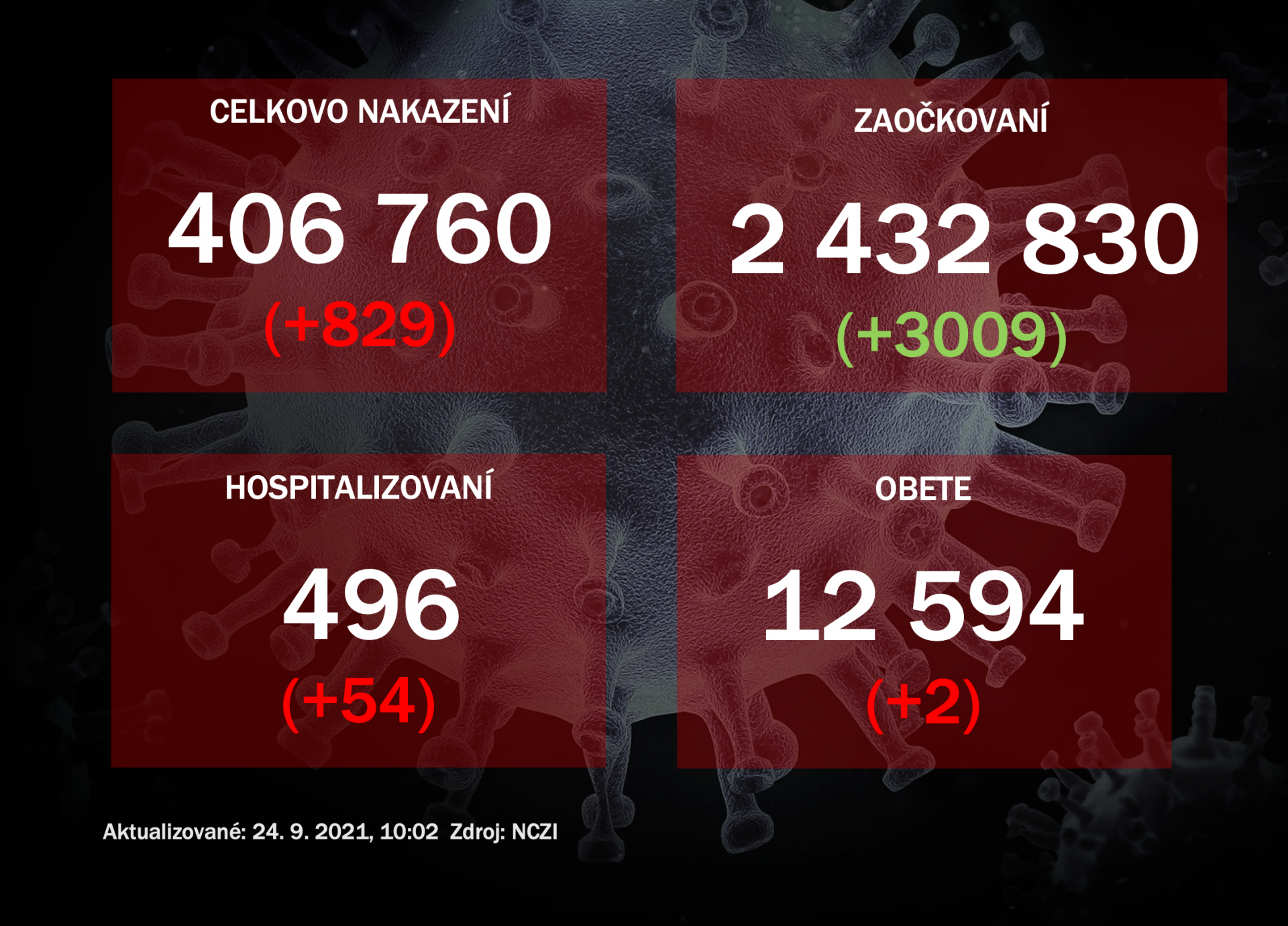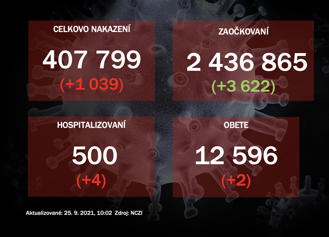 - na Slovensku je aktuálne na ochorenie covid-19 potvrdených 406 761 (+1039) prípadov, 12 596 (+2) na jej následky zomrelo a hospitalizovaných je 500 (+4) ľudí,