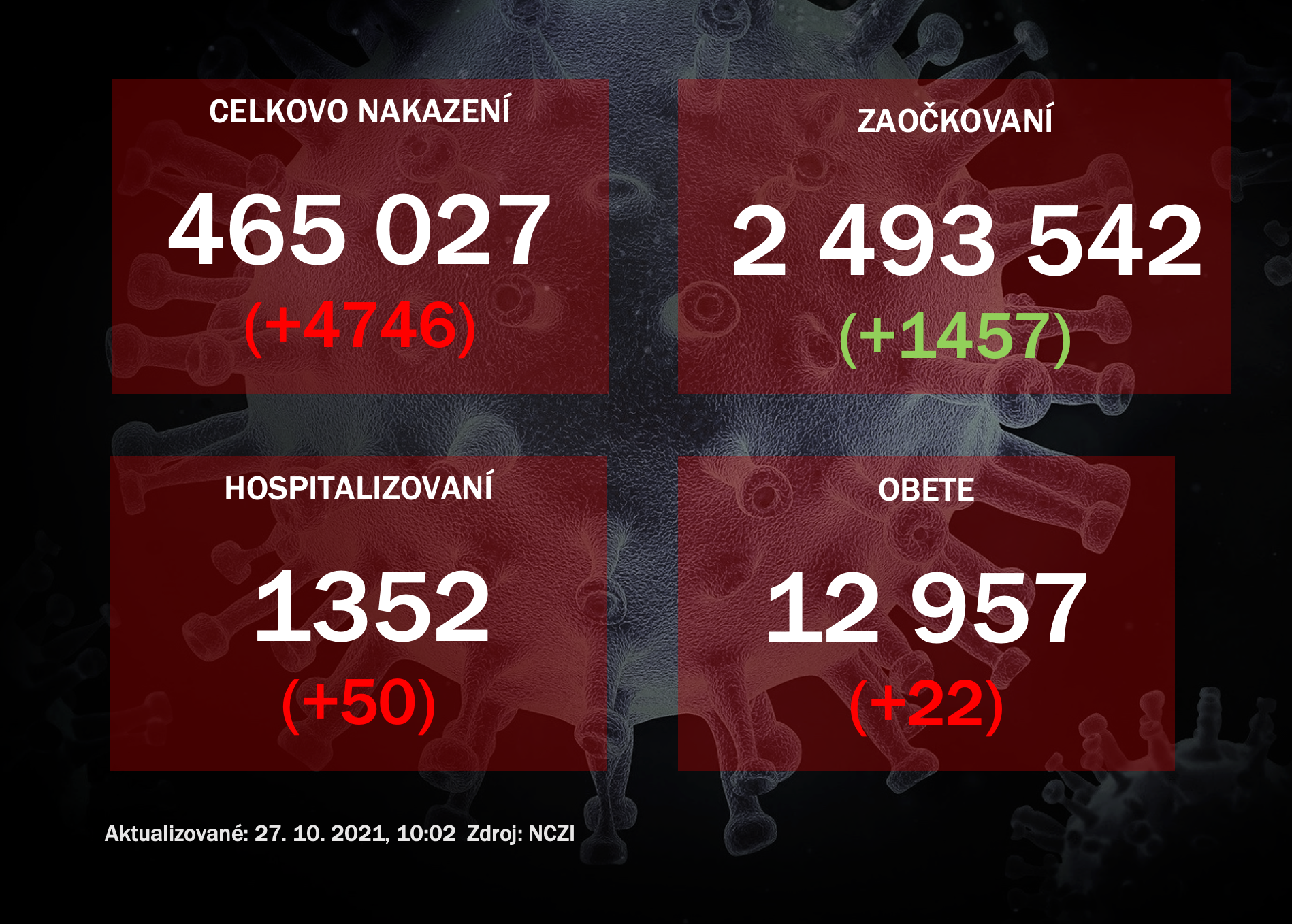 10:04 SLOVENSKO: Prostredníctvom 19.658 vykonaných RT-PCR testov odhalili v utorok (26. 10.) na Slovensku 4746 prípadov nákazy novým koronavírusom. Pribudlo tiež 22 obetí.