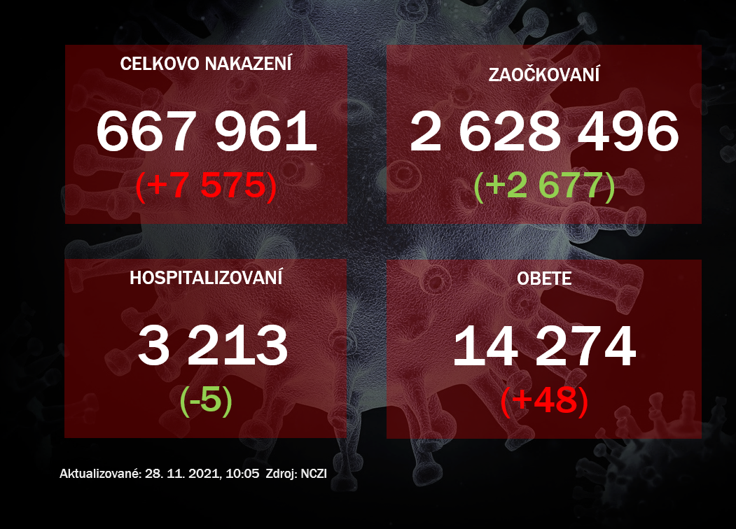 - na Slovensku je aktuálne na ochorenie covid-19 potvrdených 667 961 (+7575) prípadov, 14 274 (+48) na jej následky zomrelo a hospitalizovaných 3213 (-5) ľudí,