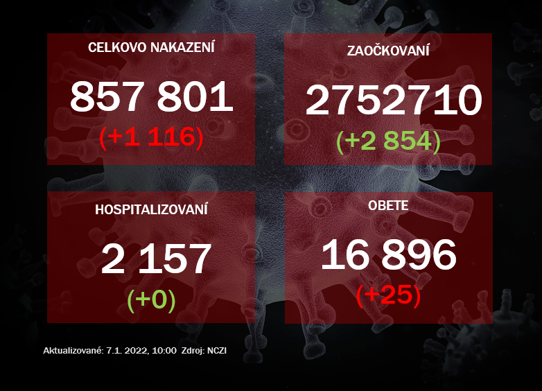 - na Slovensku je aktuálne na ochorenie covid-19 potvrdených 857 801 (+1116) prípadov, 16 896 (+25) na následky ochorenia zomrelo a hospitalizovaných je 2157 (-0) ľudí,