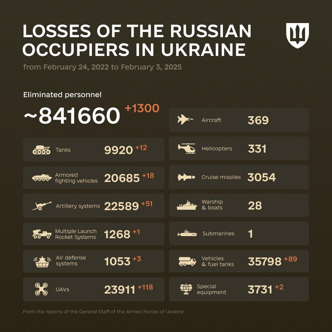 The combat losses of the enemy from February 24, 2022 to February 3, 2025. pic.twitter.com/JUqlNND7MR