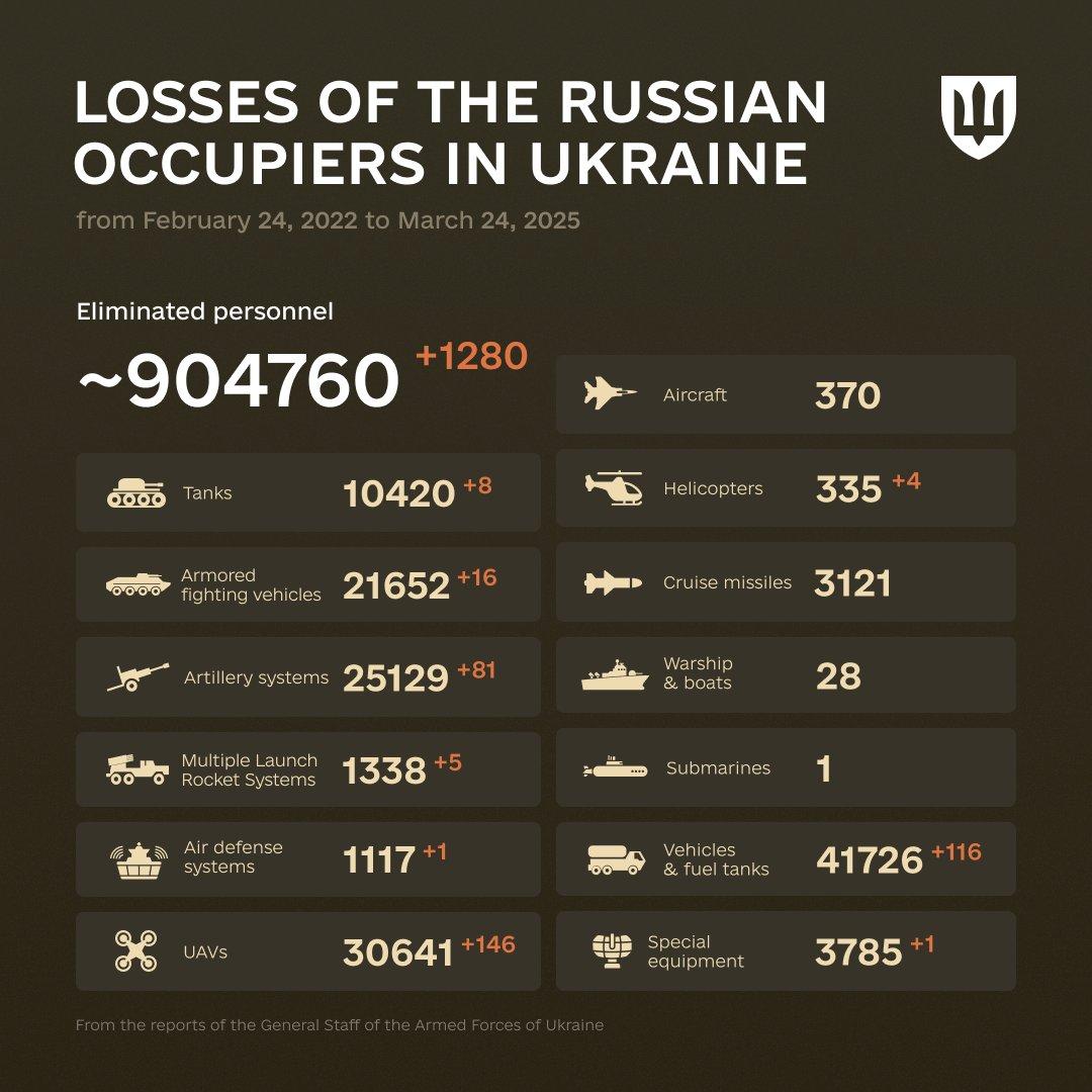 V doterajšom priebehu vojny na Ukrajine stratila ruská armáda 907 220 vojakov. Na Facebooku to uviedol generálny štáb ukrajinských ozbrojených síl. Počas utorka prišli Rusi o 1 280 vojakov, päť tankov, 15 bojových obrnených vozidiel a áut na prepravu vojakov, 59 dronov, 17 delostreleckých systémov a 77 vozidiel a autocisterien.