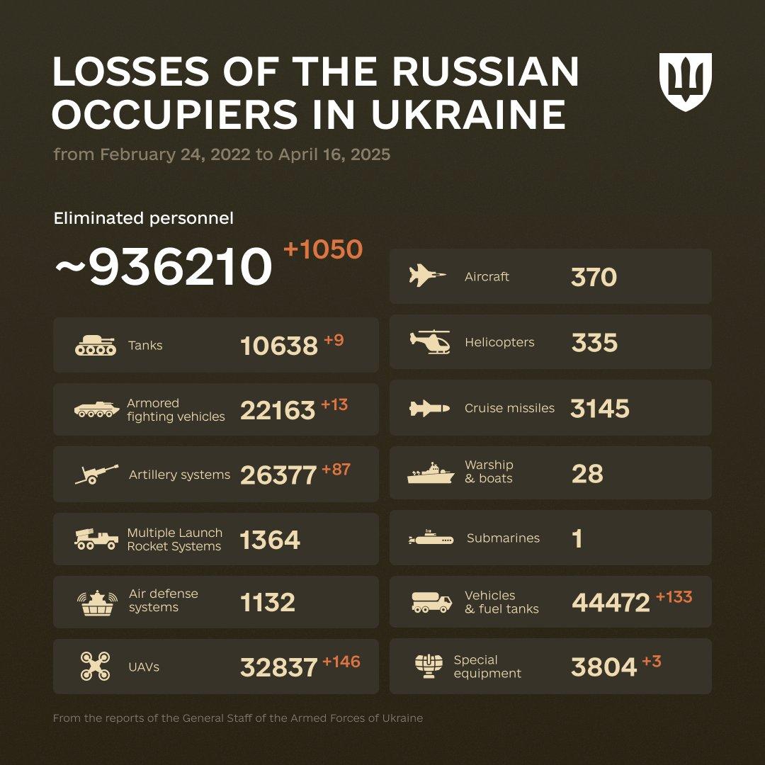 V doterajšom priebehu vojny na Ukrajine stratila ruská armáda 938 970 vojakov. Na Facebooku to uviedol generálny štáb ukrajinských ozbrojených síl. Počas štvrtka prišli Rusi o 1 530 vojakov, osem tankov, 40 bojových obrnených vozidiel a áut na prepravu vojakov, 140 dronov, 88 delostreleckých systémov a 312 vozidiel a autocisterien.