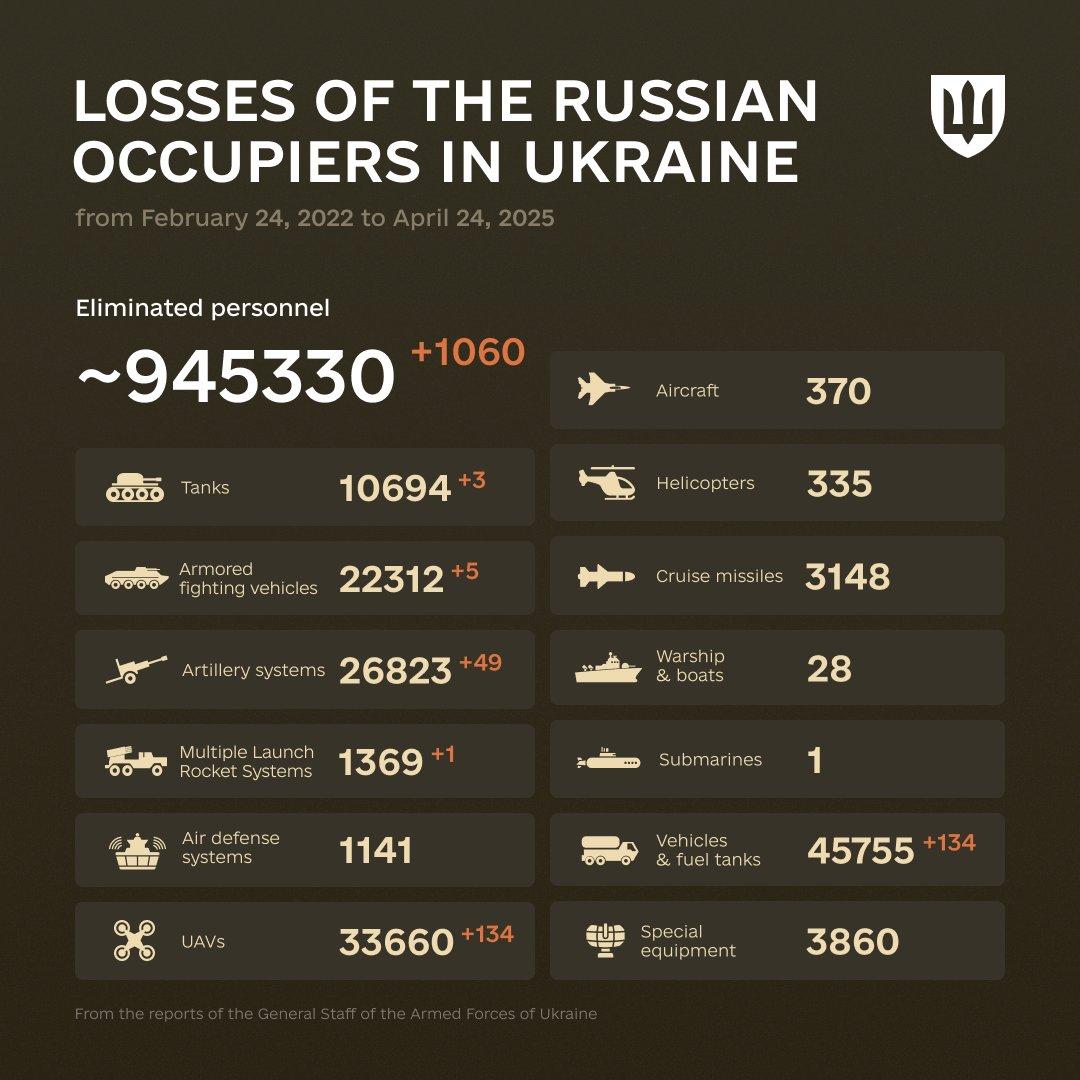 Počas uplynulého dňa na Ukrajine podľa Kyjeva Rusko stratilo 1 060 vojakov. Počet príslušníkov ruských ozbrojených síl vyradených z boja sa tak od začiatku vojny zvýšil na 945 330, uviedol vo štvrtok na Facebooku ukrajinský generálny štáb. Za uplynulý deň Moskva podľa neho prišla aj o tri tanky, päť obrnených bojových vozidiel pechoty, 49 delostreleckých systémov a jeden raketomet.
