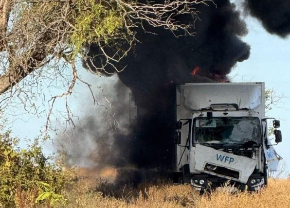 Prokudin zverejnil fotografiu, na ktorej vidno biele nákladné auto s emblémom Svetového potravinového programu v plameňoch a stúpajúci čierny dym.