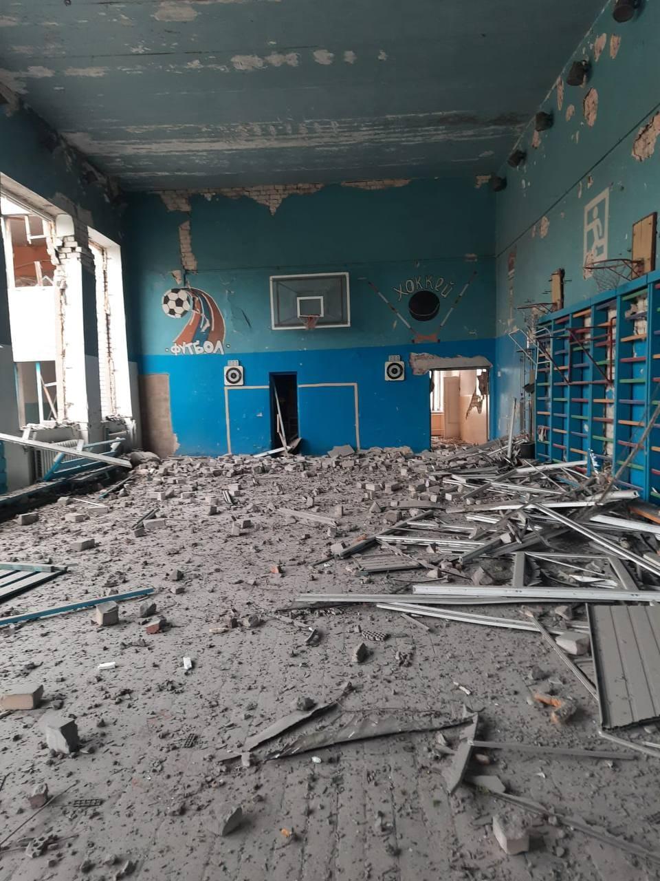 Donecká oblasť. Cukuryne. Poškodená škola po ostreľovaní