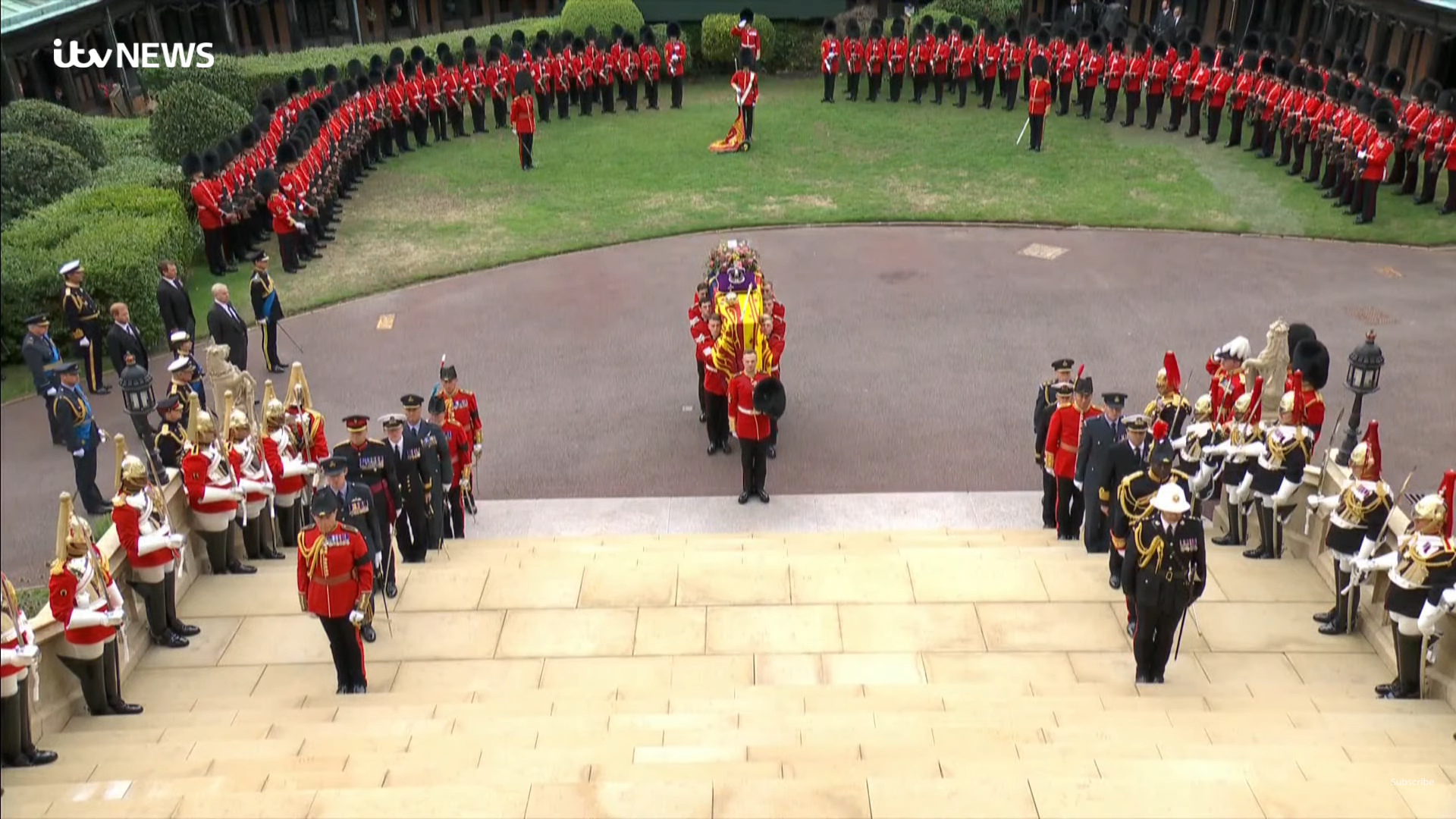 Obrad vo Windsore je súčasťou štátneho pohrebu, ktorý sa začal ešte predpoludním v Londýne. Počas neho z rakvy zložia Britskú imperiálnu korunu, jablko a žezlo, na znak konca jej vlády, kráľ Karol III. neskôr položí na rakvu vlajku regimentu gardových granátnikov, ktorý vykonáva ceremoniálne povinnosti pre panovníka, a Lord Chamberlain, najvyššie postavený predstaviteľ kráľovskej domácnosti, prelomí svoju paličku na znak toho, že končí jeho služba pre kráľovnú.