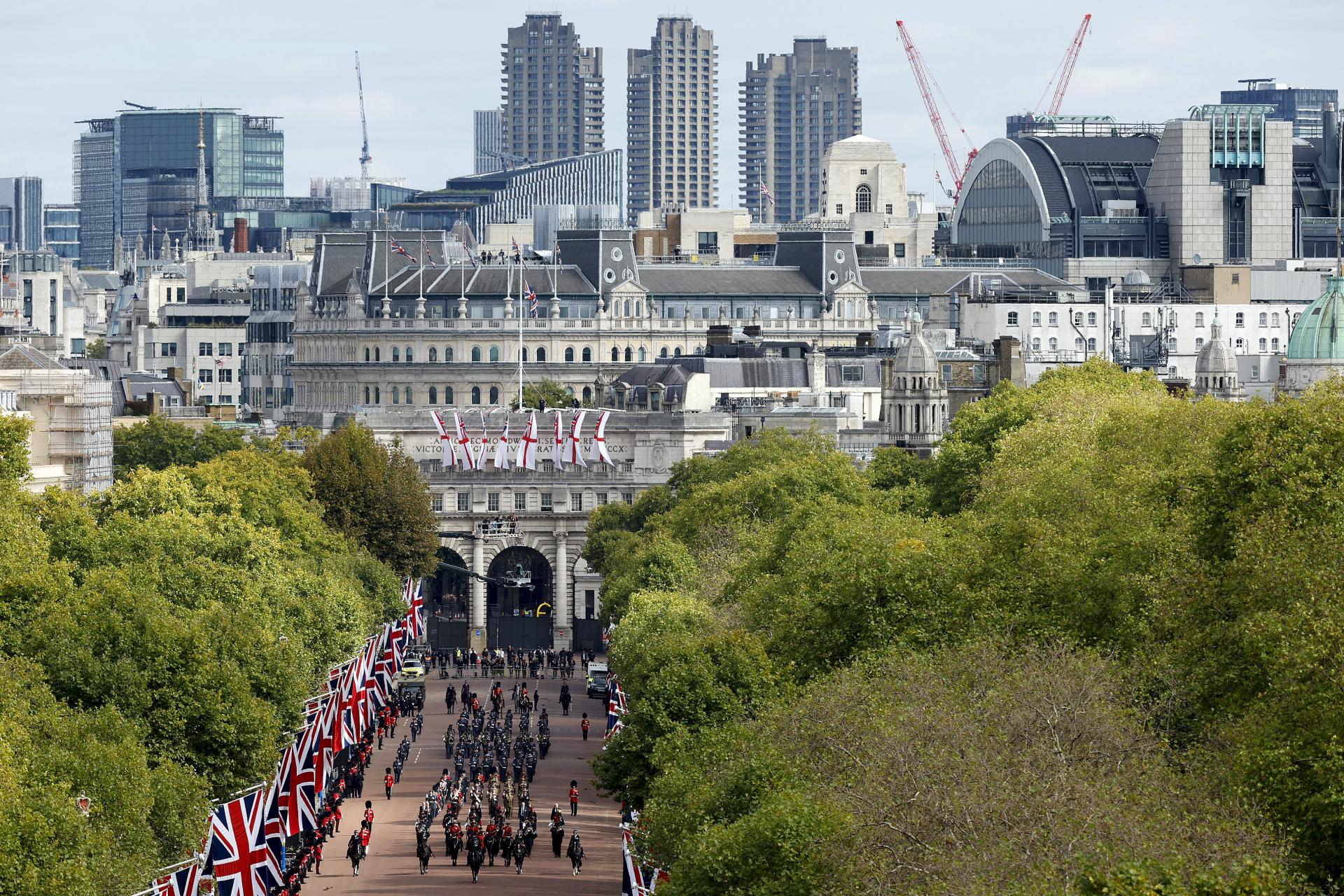 Kráľovská kanadská jazdná polícia vedie sprievod, ktorý pozostáva z príslušníkov ozbrojených síl Spojeného kráľovstva a Spoločenstva národov, policajtov a Národnej zdravotnej služby. Za lafetou s rakvou kráčajú kráľ Karol III. a ďalší členovia kráľovskej rodiny. Procesiu, ktorej trasu lemujú príslušníci ozbrojených síl a polície, sprevádza zvuk zvonu Big Ben a salvy zo zbraní.