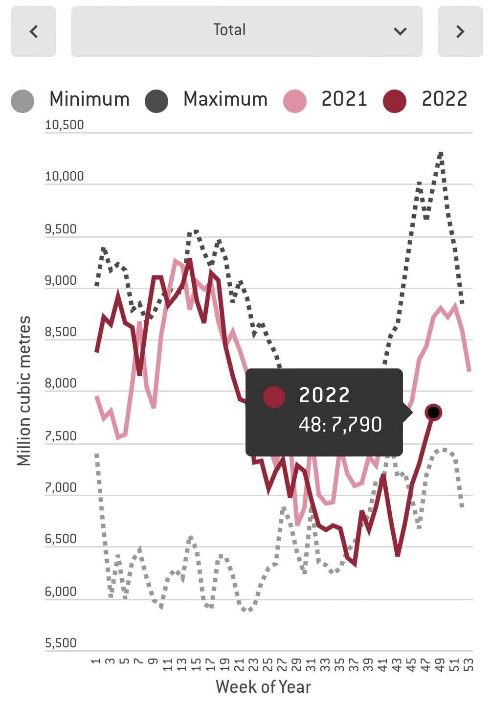 Zásoby plynu sa za roky 2015-2020 začali v priemere čerpať a znižovať presne 1. novembra. Tým začala zima, kedy priebežný prítok nestačil kryť spotrebu. Tento rok začala EÚ čerpať zo zásob 14. novembra, čo je oproti priemeru o 2 týždne neskôr.