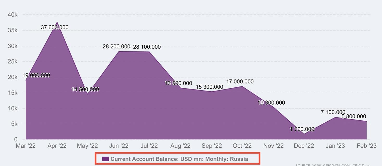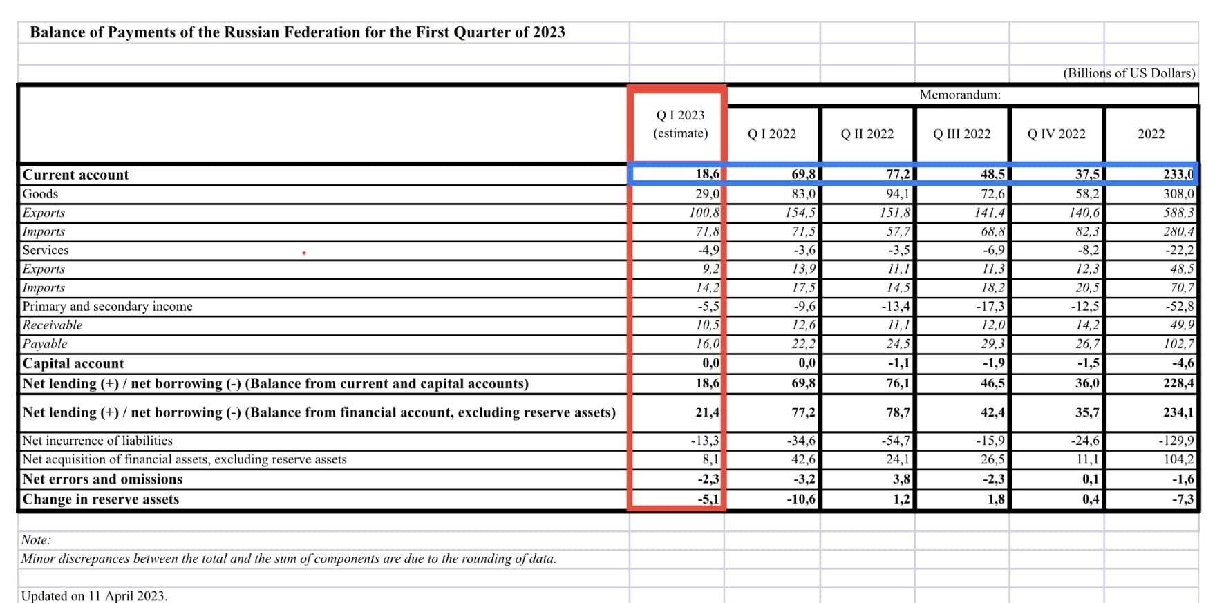 Ľudskou rečou povedané: Rusko doviezlo za prvé 3 mesiace roka 2023 tovary a služby v rovnakej hodnote ako v prvých 3 mesiacoch minulého roka: 86 vs. 89 miliárd dolárov ($).