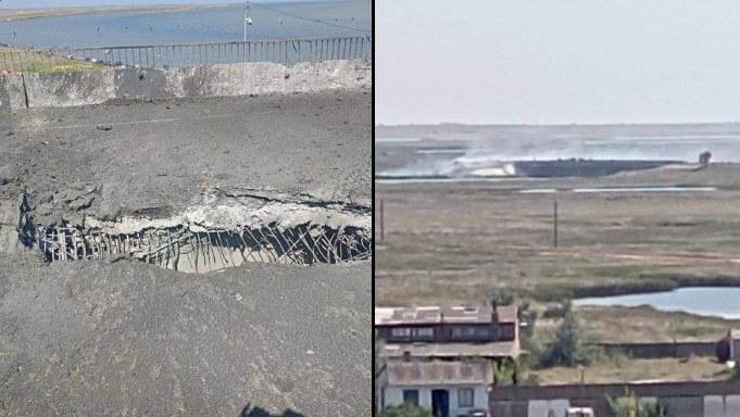 🔹The bridge over the Tonkyi Strait near Henichesk, which connects the town of Henichesk with the Arabat Spit. The gas pipeline next to the bridge was damaged.