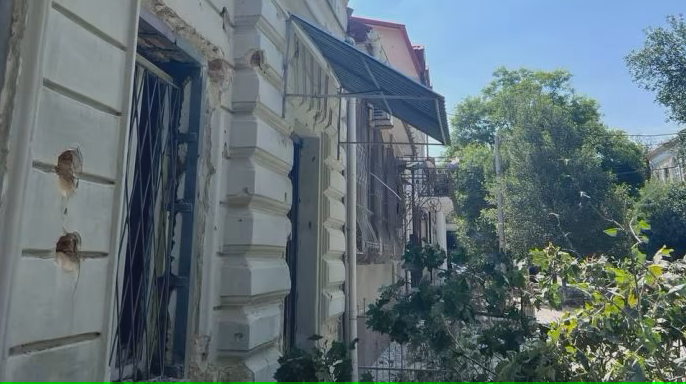 ukrainska pravdaPoškodené budovy v Chersone po ruskom útoku.