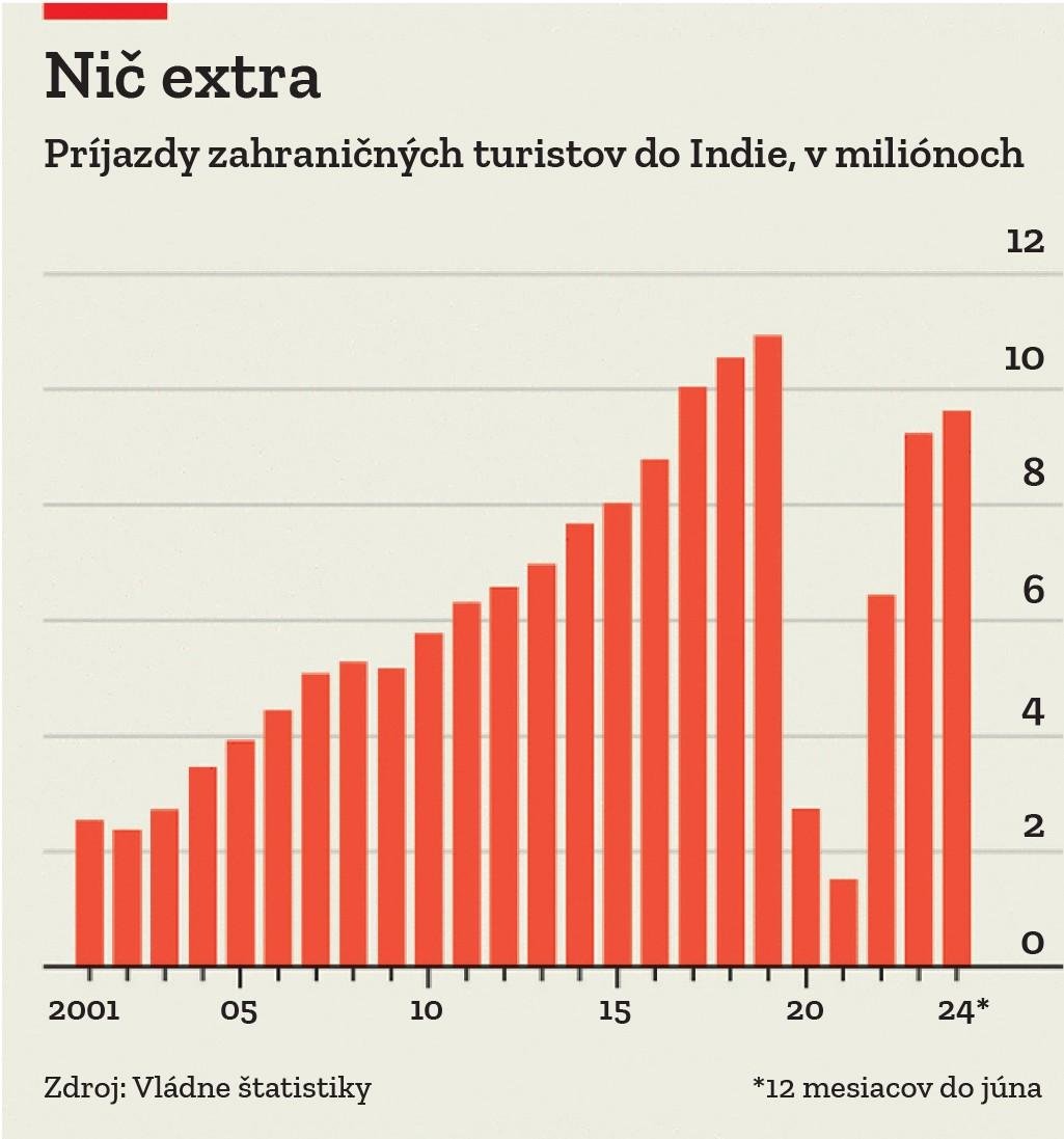 Pán Van der Meij je ten typ turistu, o ktorého sa väčšina krajín bije: úprimne nadšený, cestuje na dlhší čas, hľadá pohodlie a je ochotný si aj trochu priplatiť. India so 43 pamiatkami zapísanými na zozname UNESCO, bohatou históriou, prírodnými krásami a rozmanitou kuchyňou by mala byť pre cestovateľov magnetom. Napriek tomu je táto krajina veľkosti kontinentu ako cieľová destinácia slabo úspešná. Počet prichádzajúcich zahraničných turistov dosiahol v roku 2019 vrchol na úrovni 10,9 mil. V tom istom roku Dubaj (počet pamiatok svetového dedičstva: nula) prilákal 16,7 mil. návštevníkov. V prvom polroku 2024 vzrástol počet návštevníkov Dubaja v porovnaní s rokom 2019 o 11 %. V prípade Indie došlo k poklesu o 10 %.