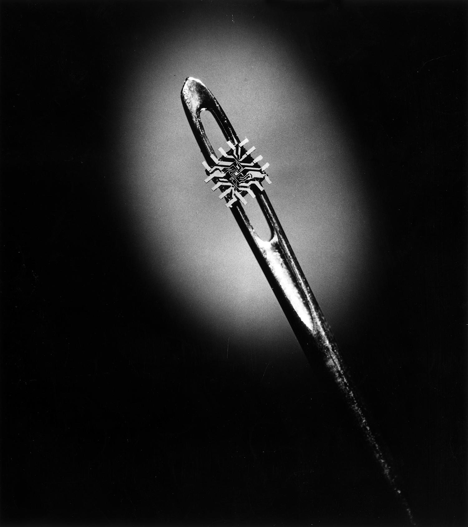 KEYSTONE/GETTY IMAGESMiniatúrny integrovaný obvod spoločnosti Western Electric z roku 1979 obsahoval 18 diód, štyri tranzistory a osem rezistorov. Čip bol široký jednu dvadsatinu palca.